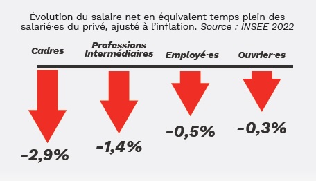 - Les cadres et professions intermédiaires pénalisés par cette politique injuste : la principale conséquence de l’austérité salariale et de l’inflation est la perte de pouvoir d’achat pour les ingés, cadres, techs qui frappe plus durement les salaires au-delà du SMIC (Baromètre Ugict-CGT) jusqu’à -1,2% en 2022 (Insee, https://www.insee.fr/fr/statistiques/7707884). En 2023, dans le secteur privé, le salaire net moyen en euros constants a baissé de 2,9% pour les cadres et de 1,4% pour les professions intermédiaires (https://www.insee.fr/fr/statistiques/8270416).